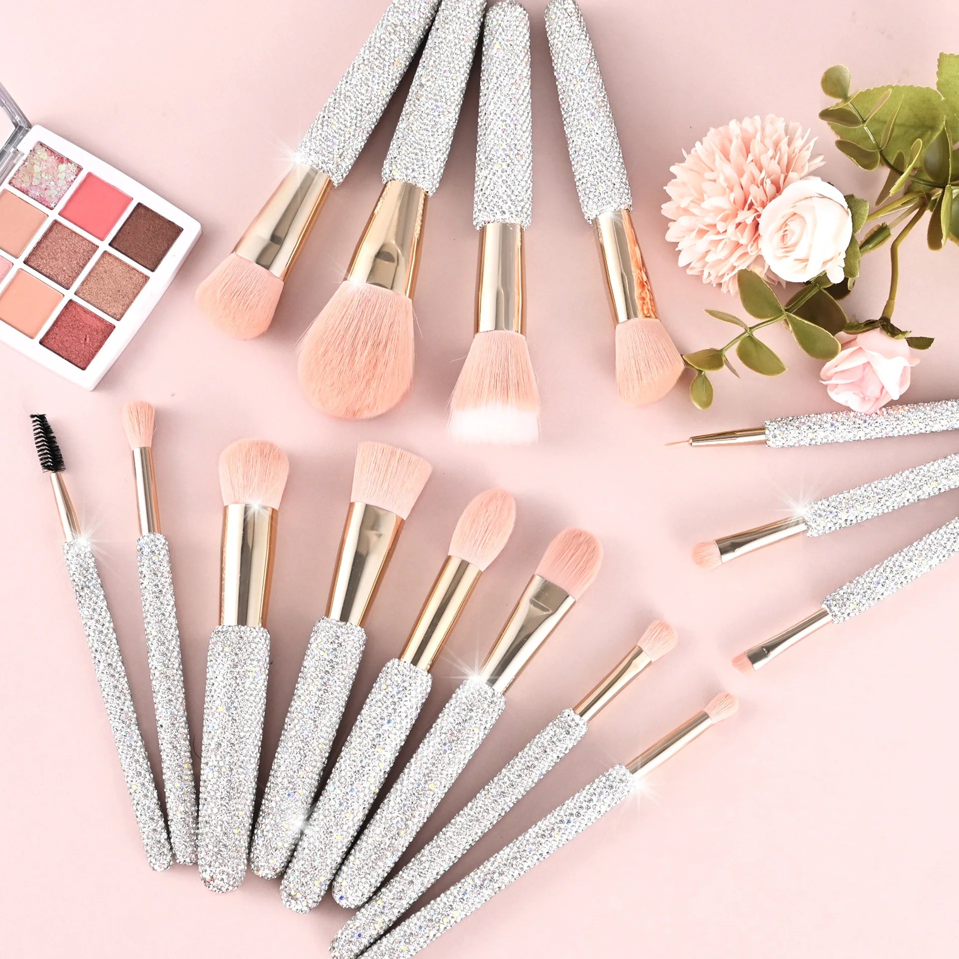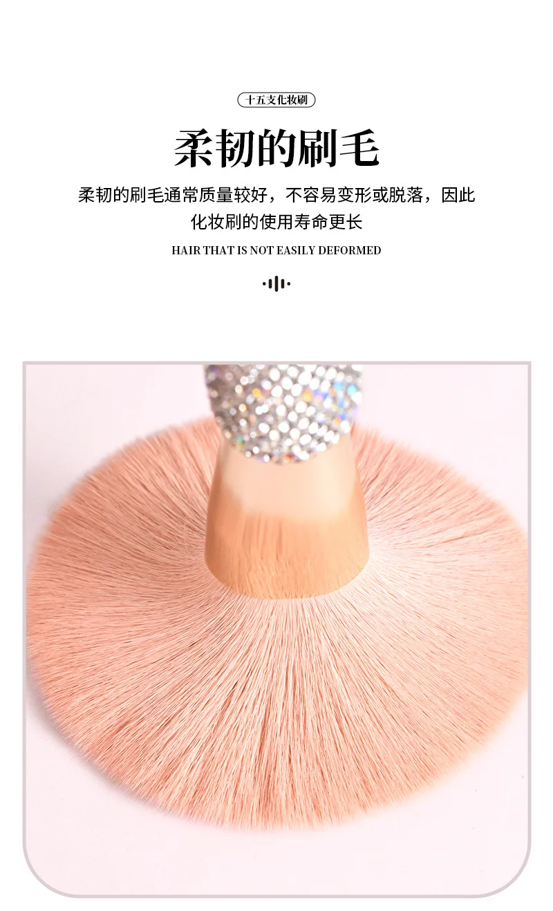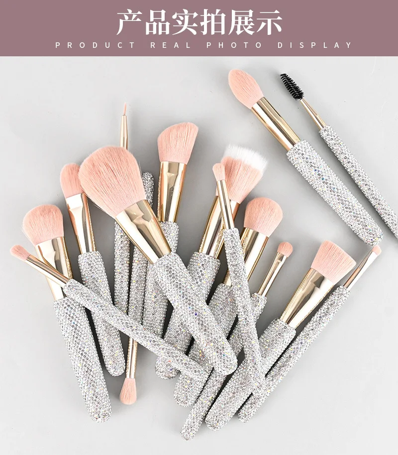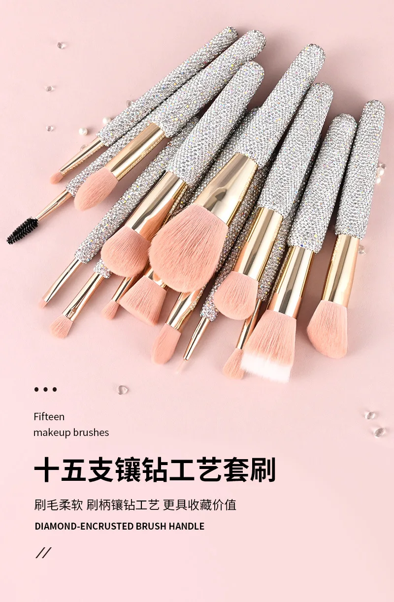 15 Pc Rhinestone Makeup Brush Set Pink Blush Foundation Concealers Eye Shadow & Loose Powder Brushes Cosmetic Organizer Gift Set