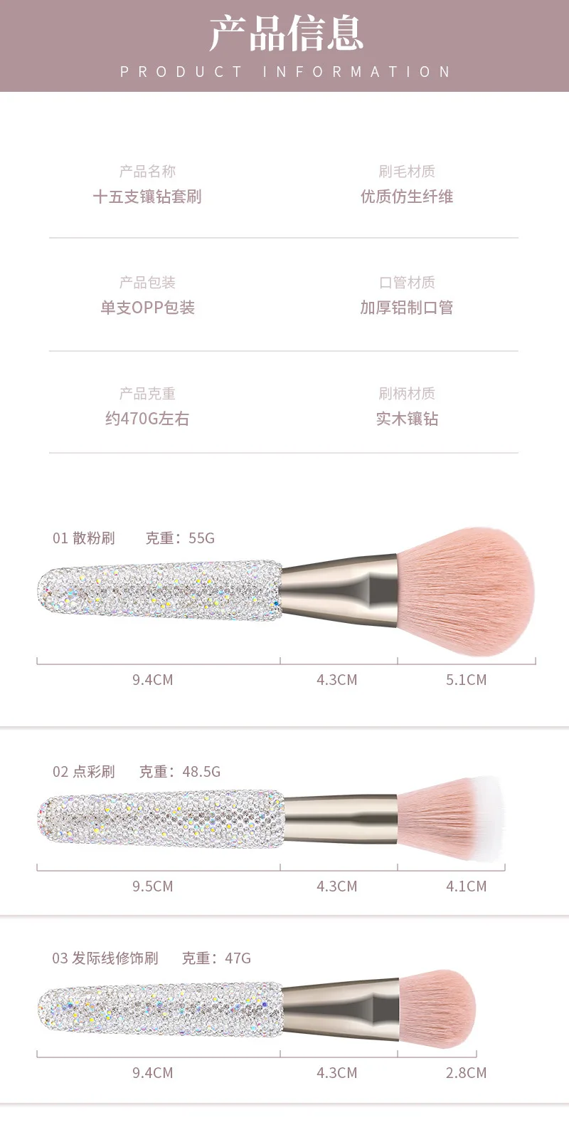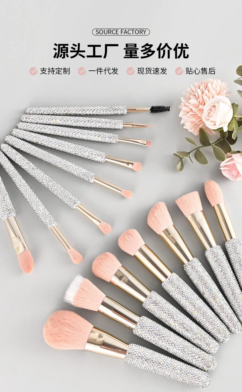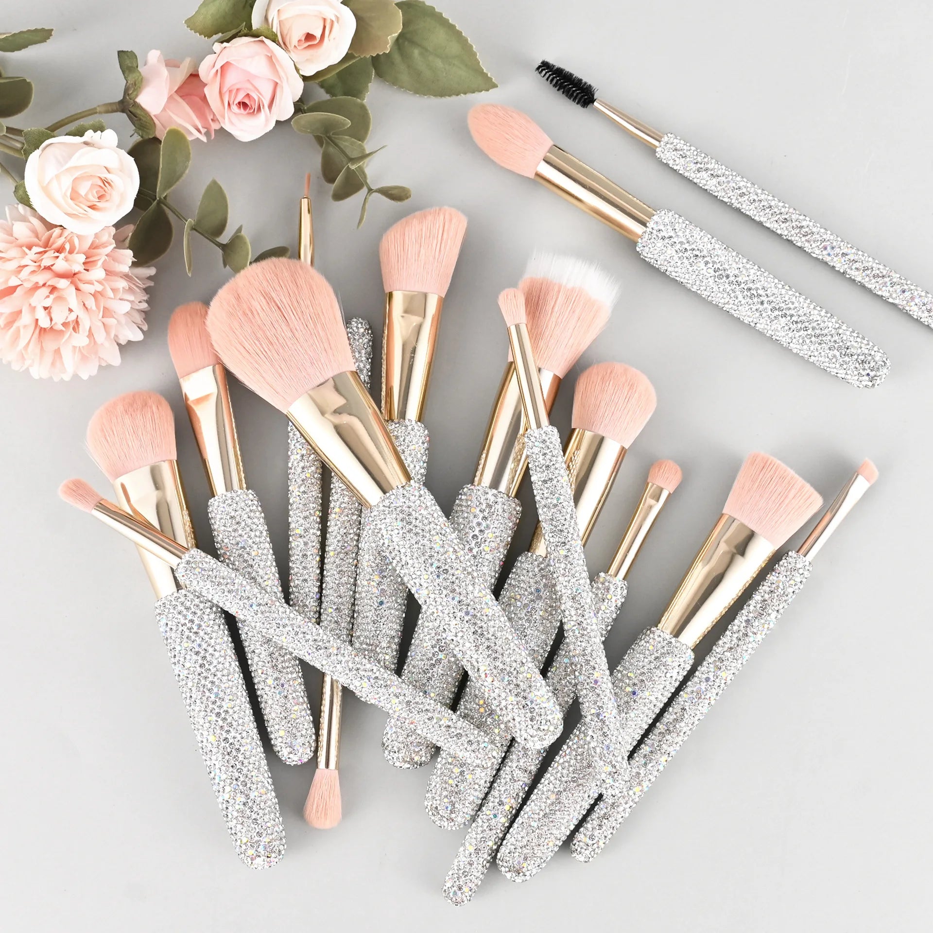 15 Pc Rhinestone Makeup Brush Set Pink Blush Foundation Concealers Eye Shadow & Loose Powder Brushes Cosmetic Organizer Gift Set